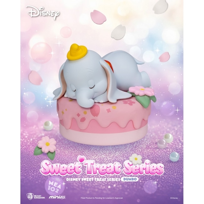 小飛象 (Dumbo)大耳朵搭配小黃帽,蜷著身子趴在粉嫩蛋糕上,睡顏軟萌療癒。