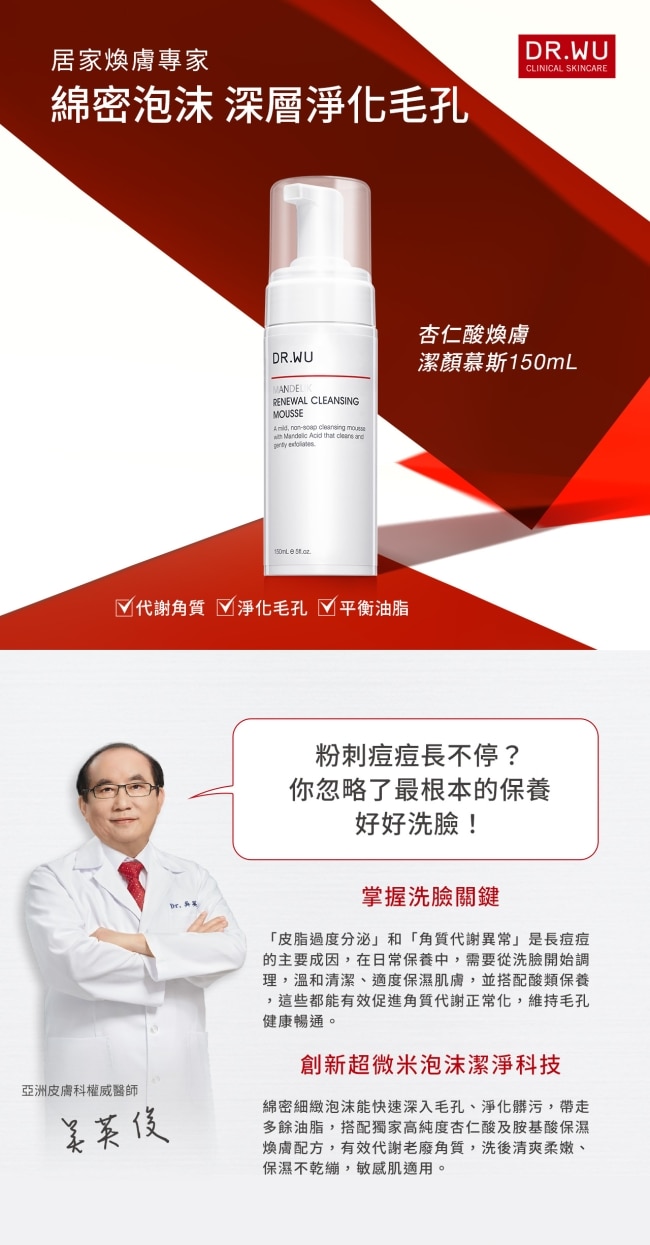 DR.WU創新超微米泡沫潔淨科技與高濃度杏仁酸完美結合以綿密細緻的泡沫快速深入毛孔帶走髒汙及多餘油脂清潔同時溫和代謝老廢角質及黑、白頭粉刺緊緻毛孔還原細緻亮白肌。結合胺基酸保濕配方深層潔淨同時洗後保濕不緊繃全配方無皂鹼、酒精、色素、香精敏弱肌膚質也適用。