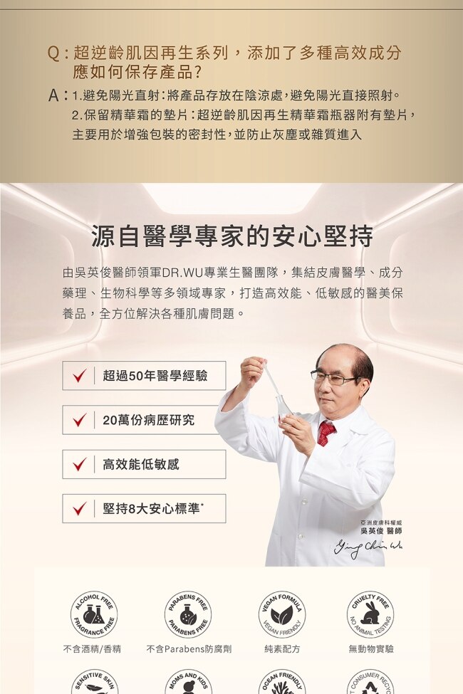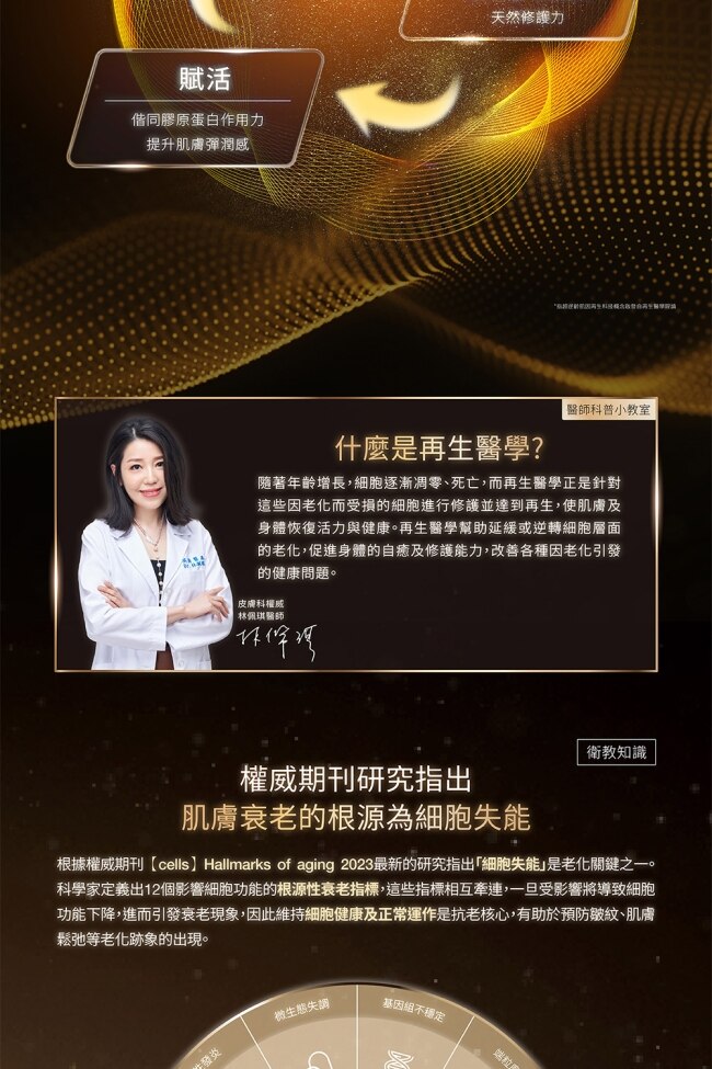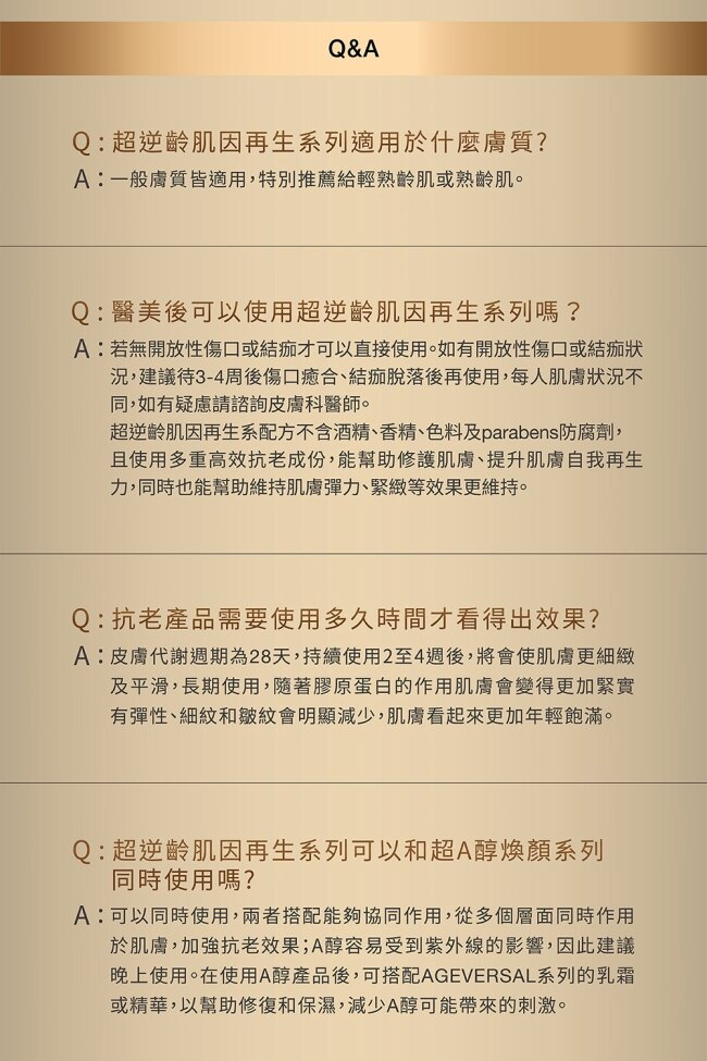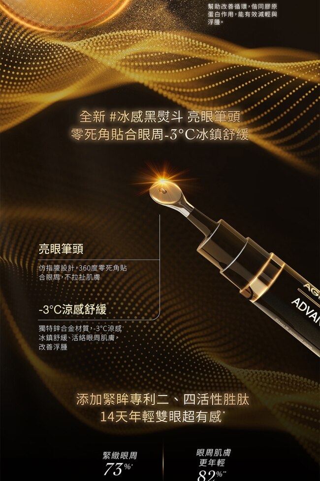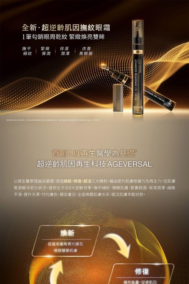 針對眼周皺紋、細紋、暗沉、浮腫、鬆弛設計的全能抗老眼霜能深層修護、促進肌膚新生、賦活眼周肌膚。含四大活性胜肽高濃度五胜肽、六胜肽及緊眸專利二、四活性肽偕同膠原蛋白及彈性蛋白作用減少皺紋、撫平細紋、緊緻肌膚。全新超逆齡肌因再生科技AGEVERSAL全面啟動肌因年輕從根源改善老化問題。添加酵母菌外泌體及珍稀雪絨花精萃高效修復更安全加速緊緻拉提。緊實眼周、重現年輕緊緻雙眸。超逆齡肌因撫紋眼霜屬於機能型抗老眼霜根據再生醫學理論深入研究肌膚衰老的關鍵透過煥新-修復-賦活三大機制有效全面解決眼周肌膚的瑕疵問題還原肌膚年輕狀態搭配獨特鋅合金材質按摩頭圓弧曲線設計能夠完美貼合眼周輪廓並提供急速-3°C涼感冰鎮效果能夠達到舒緩、活絡眼周肌膚的效果。