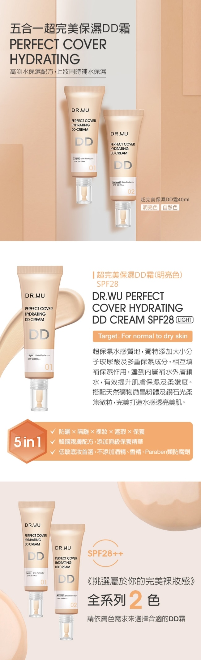 超完美保濕DD霜同時擁有BB霜高遮瑕自然妝效及CC霜膚色的校色補光效果輕鬆打造出自然透亮服貼妝容獨特添加大小分子玻尿酸及多重保濕成分達到內層補水外層鎖水即使帶妝也能維持肌膚不乾澀。搭配高遮瑕微細礦質粉體技術輕薄不厚重。