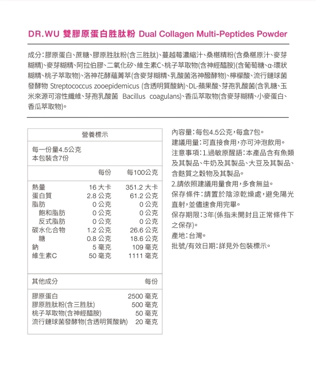 • 雙胜肽6000mg 每日兩包營養補充更到位
