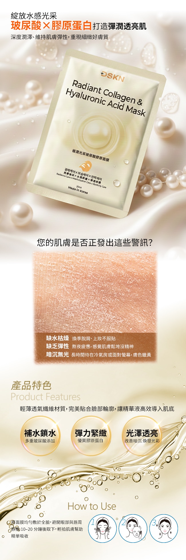 | 中文品名 | 【DSKN 德斯研】極潤光采玻尿酸膠原面膜 |