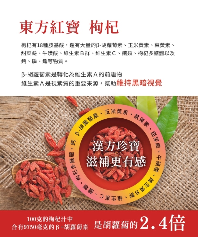 枸杞有18種胺基酸還有大量的B-胡蘿蔔素、玉米黃素、葉黃素、