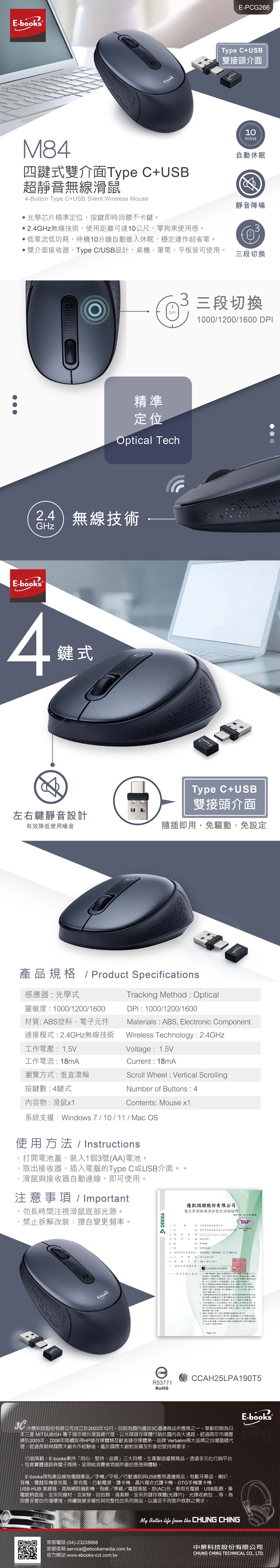 E-books M84 四鍵式雙介面Type C USB超靜音無線滑鼠