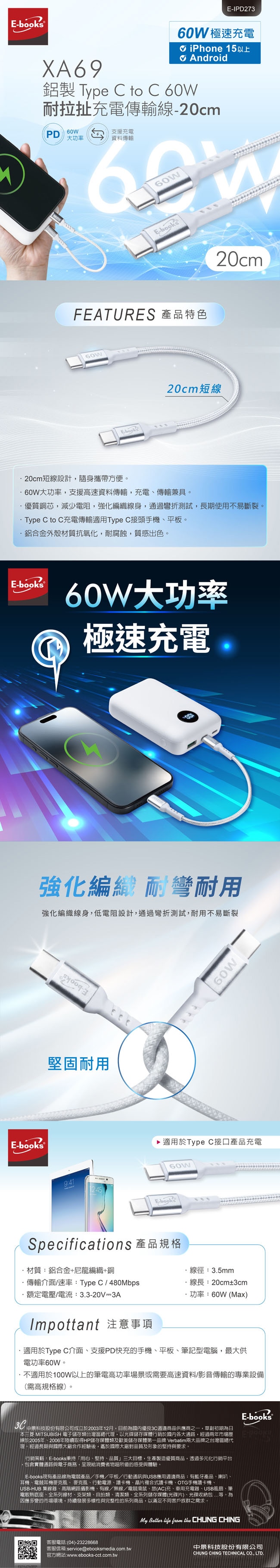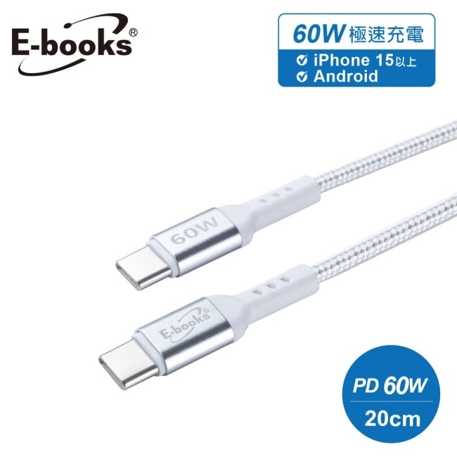 E-books XA69 鋁製Type C to C 60W耐拉扯充電傳輸線-20cm