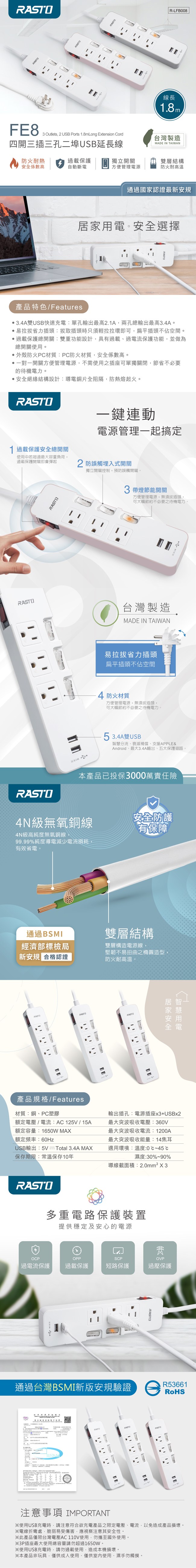 RASTO FE8 四開三插三孔二埠USB延長線 1.8M