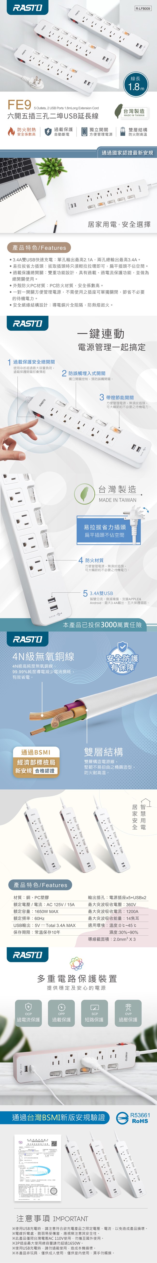 RASTO FE9 六開五插三孔二埠USB延長線 1.8M