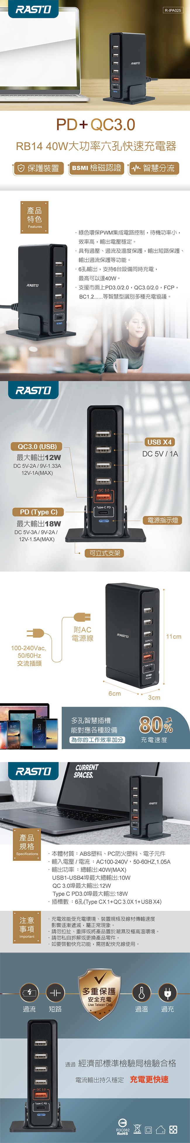 功率總輸出:40W(MAX) USB1-USB4埠最大總輸出:10W QC 3.0埠最大輸出:12W Type C PD3.0埠最大輸出:18W