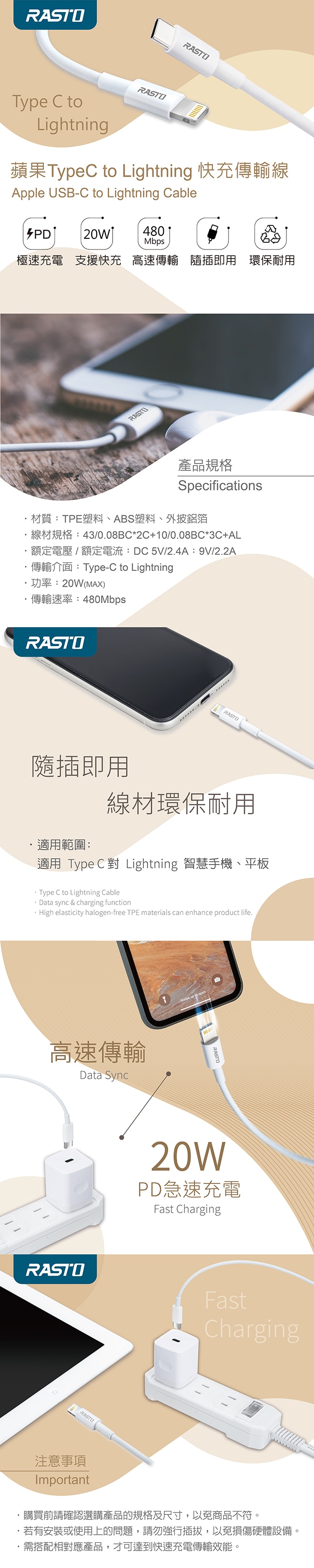 RASTO RX44 蘋果Type C to Lightning快充傳輸線2M