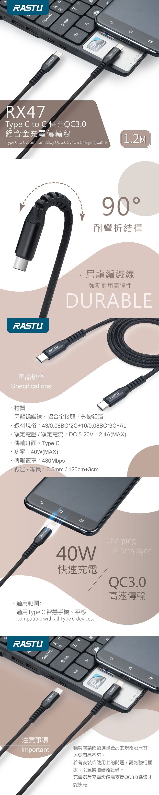 RASTO RX47 Type-C to C 快充QC3.0鋁合金充電傳輸線1.2M