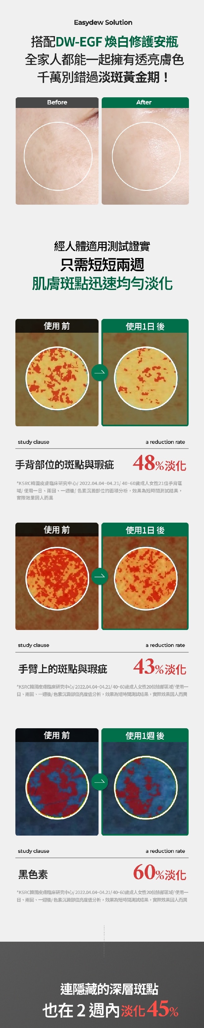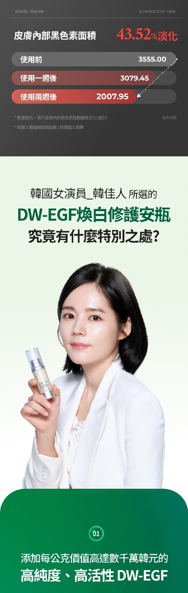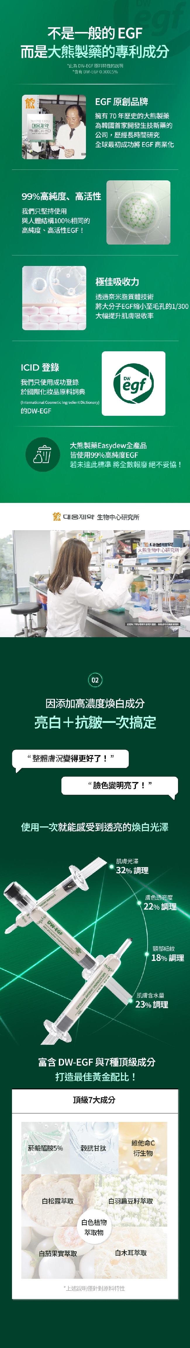 | 目的功效 | 獨家專利高純度、高活性 DW-EGF調理肌膚底層均勻膚色與淡化瑕疵 |