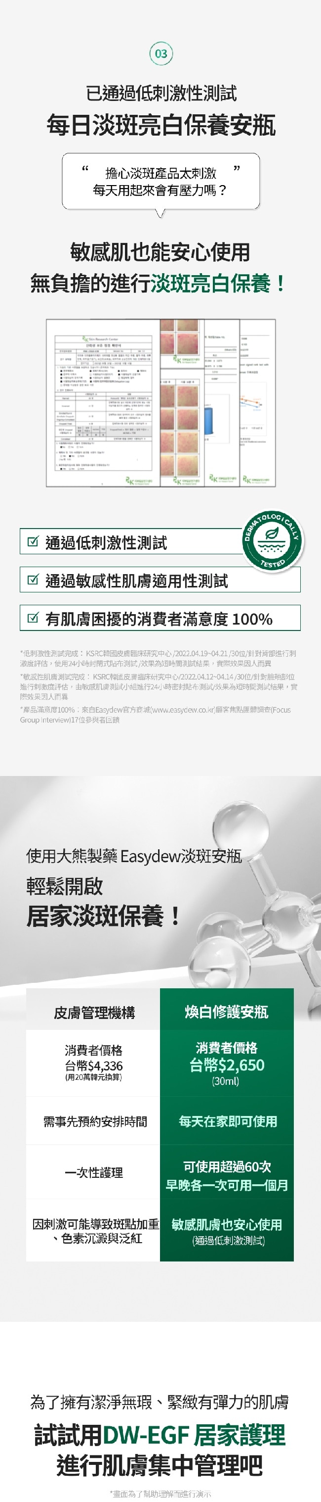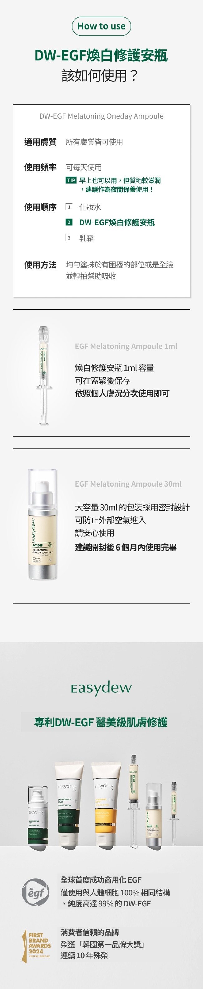 韓國最大藥廠-大熊製藥所研發的醫美級護膚品牌擁有超過 30 年皮膚醫學與生物科技研發實力。全商品為韓國研發生產。品牌核心成分DW-EGF 高活性表皮生長因子在台灣及多國取得專利特別針對敏弱肌/痘痘肌與術後肌膚提供溫和且高效的護理方案。Easydew 在韓國也因此被譽為-醫師推薦保養品深受醫美診所與專業皮膚科信賴。採用獨家專利高純度、高活性 DW-EGF強化肌膚屏障提升修護與穩定力透亮感即現肌膚明亮光澤有感通過低敏測試配方溫和不刺激敏感肌也能安心使用。韓國最大藥廠-大熊製藥所研發的醫美級護膚品牌擁有超過 30 年皮膚醫學與生物科技研發實力。全商品為韓國研發生產。品牌核心成分DW-EGF 高活性表皮生長因子在台灣及多國取得專利特別針對敏弱肌/痘痘肌與術後肌膚提供溫和且高效的護理方案。Easydew 在韓國也因此被譽為-醫師推薦保養品深受醫美診所與專業皮膚科信賴。採用獨家專利高純度、高活性 DW-EGF強化肌膚屏障提升修護與穩定力透亮感即現肌膚明亮光澤有感通過低敏測試配方溫和不刺激敏感肌也能安心使用。
