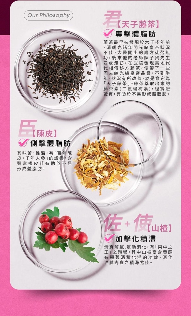 3.內容物成分藤茶抽出物、陳皮抽出物、山楂抽出物、微結晶狀 α纖維素、羧甲基纖維素鈉