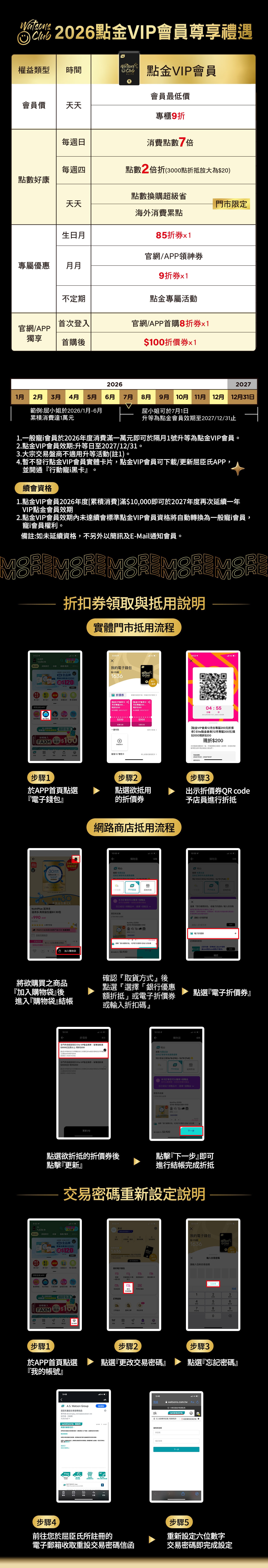 1.凡屈臣氏點金VIP會員下載屈臣氏APP且完成綁定行動寵i卡,即可每月於屈臣氏APP電子錢包獲得9折電子折價券乙張 (單筆消費最高可折抵500元),電子折價券皆會於每月首5日匯入新券至APP電子錢包中;新升等之點金VIP會員其電子折價券匯入時間為升等後隔月。
