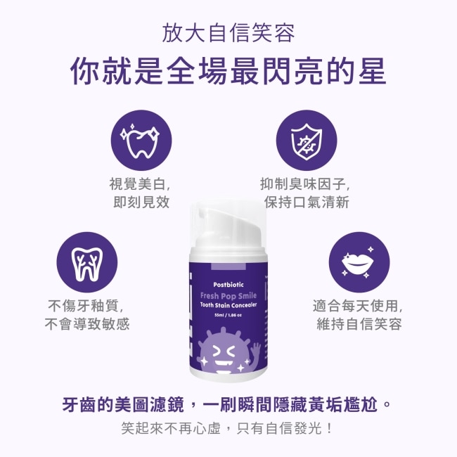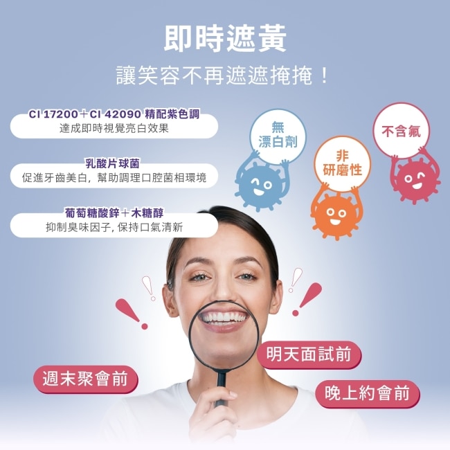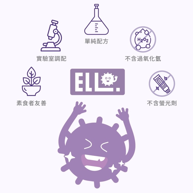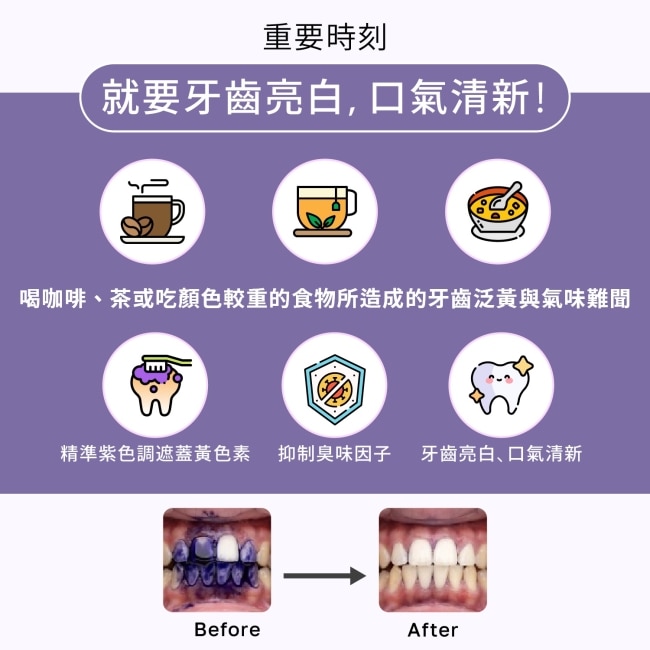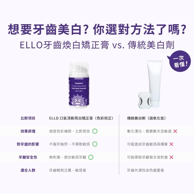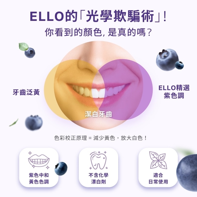 ELLO 益生菌口氣清新亮白矯正膏 結合了尖端色彩學與口腔益生菌技術,特別採用精選食用級紫色調。根據色彩互補原理,紫色能精準中和齒面的黃色調,在塗抹後的瞬間達到視覺上的立即亮白效果,就像為牙齒抹上了校色飾底乳,讓你的笑容在鏡頭下或是面對面時都能自信放閃。