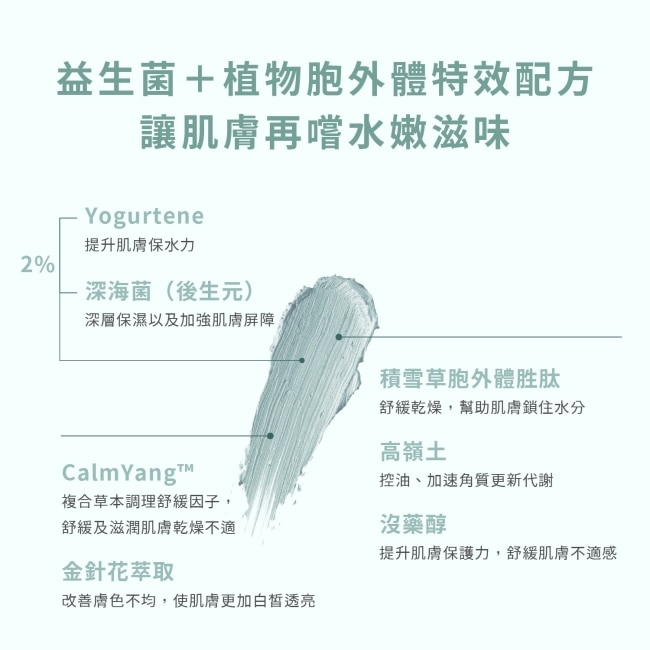 CalmYangTM 專利複合成分天然植萃力量深層舒緩,讓受壓力或環境刺激的肌膚獲得釋放。