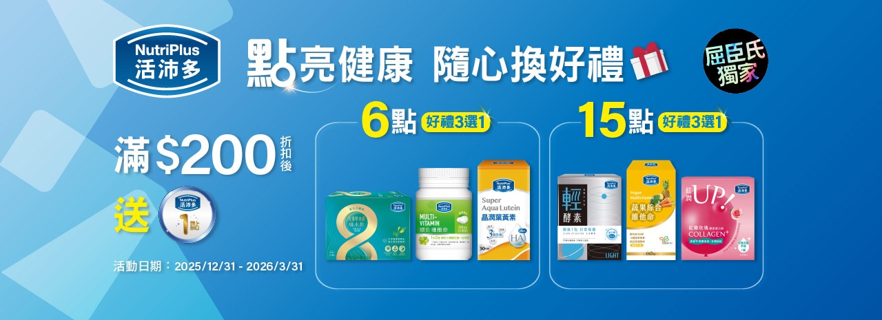 2026/3/31前於屈臣氏實體門市、網路商店、APP購買活沛多系列商品滿$200就送1點數位印花