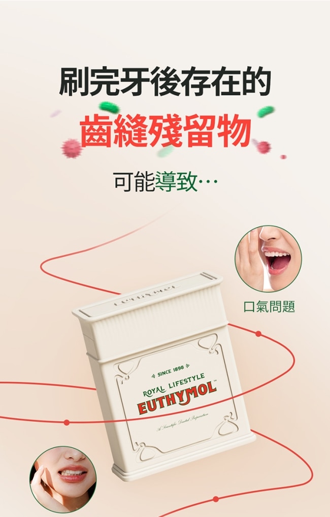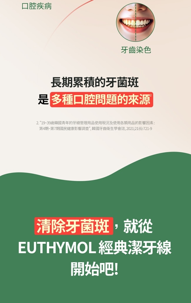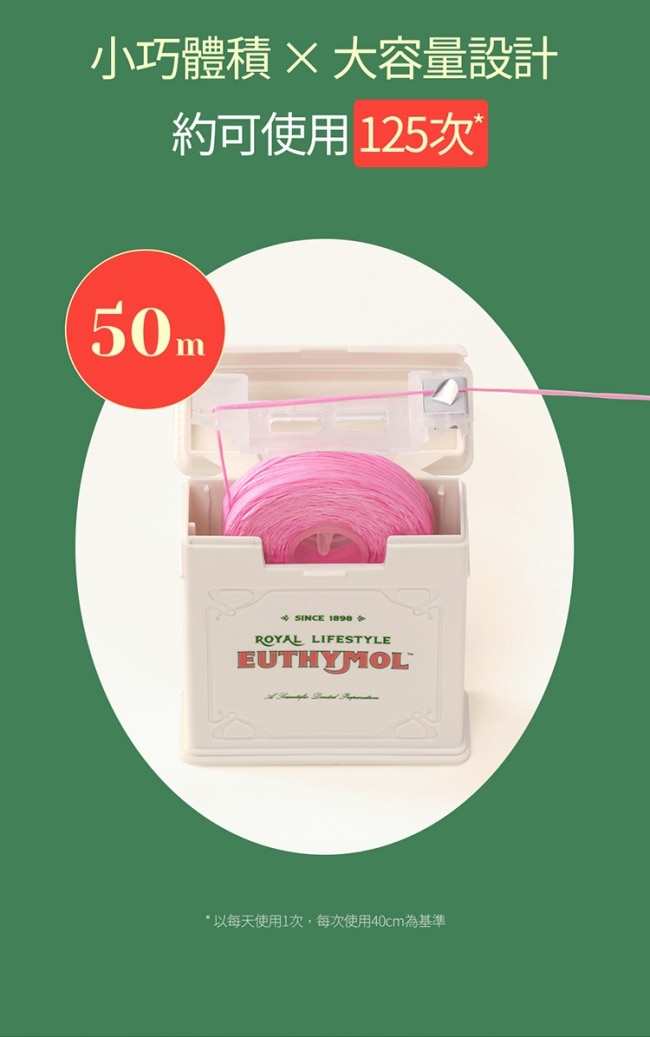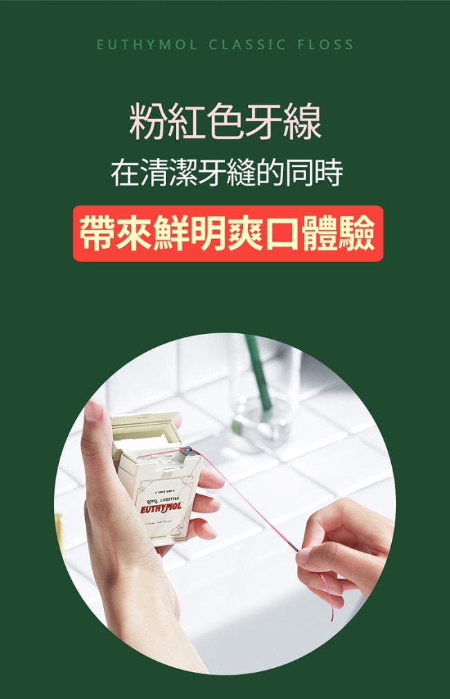 粉紅色潔牙線、花樣沁桃清爽薄荷味道、專為齒縫窄設計、純素蠟塗層、384條特殊加工纖維徹底清除齒間汙垢、與EUTHYMOL牙刷同時使用,提升牙間菌斑清除率