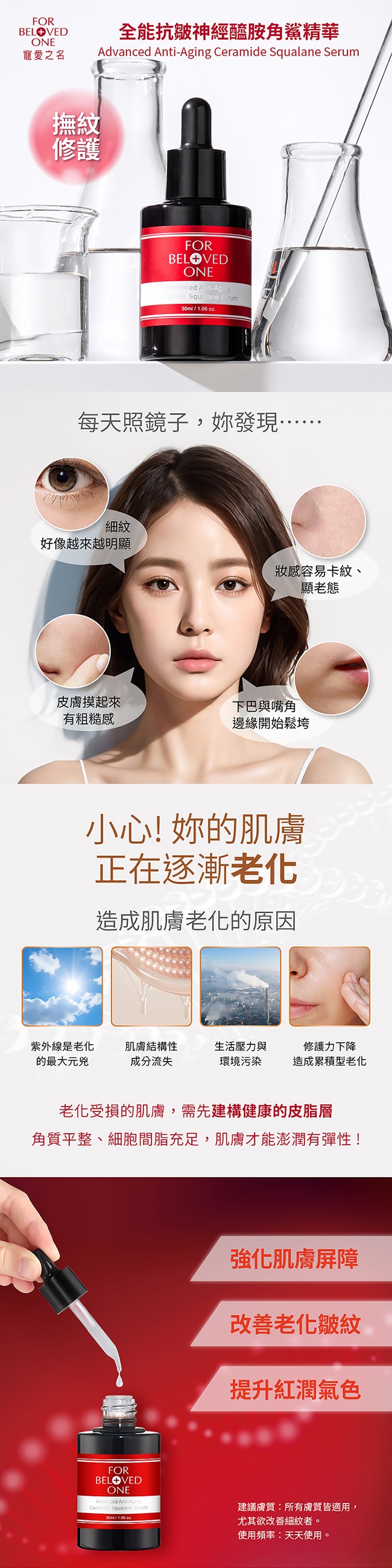 1.專為熟齡與乾燥疲弱肌設計以高濃度神經醯胺結合角鯊、玻尿酸打造多重修護防禦力。