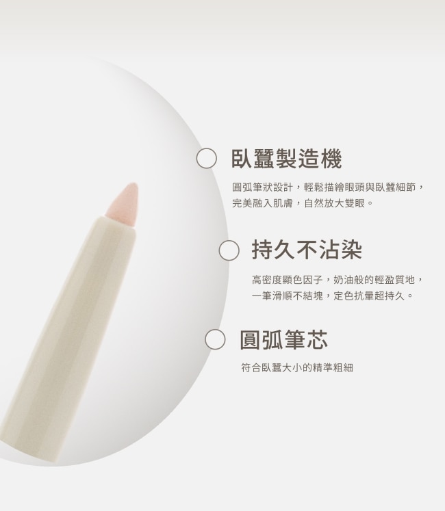 圓弧筆狀設計輕鬆描繪眼頭與臥蠶細節搭配高密度顯色因子奶油般的輕盈質地