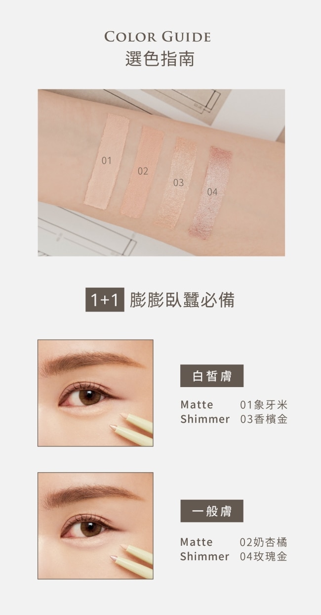 | 商品簡述 | 圓弧筆狀設計輕鬆描繪眼頭與臥蠶細節搭配高密度顯色因子奶油般的輕盈質地一筆滑順不結塊定色抗暈 |
