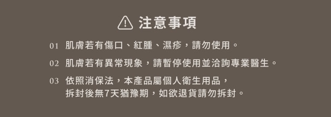 肌膚若有異常與不適感請暫停使用並洽詢專業醫生。