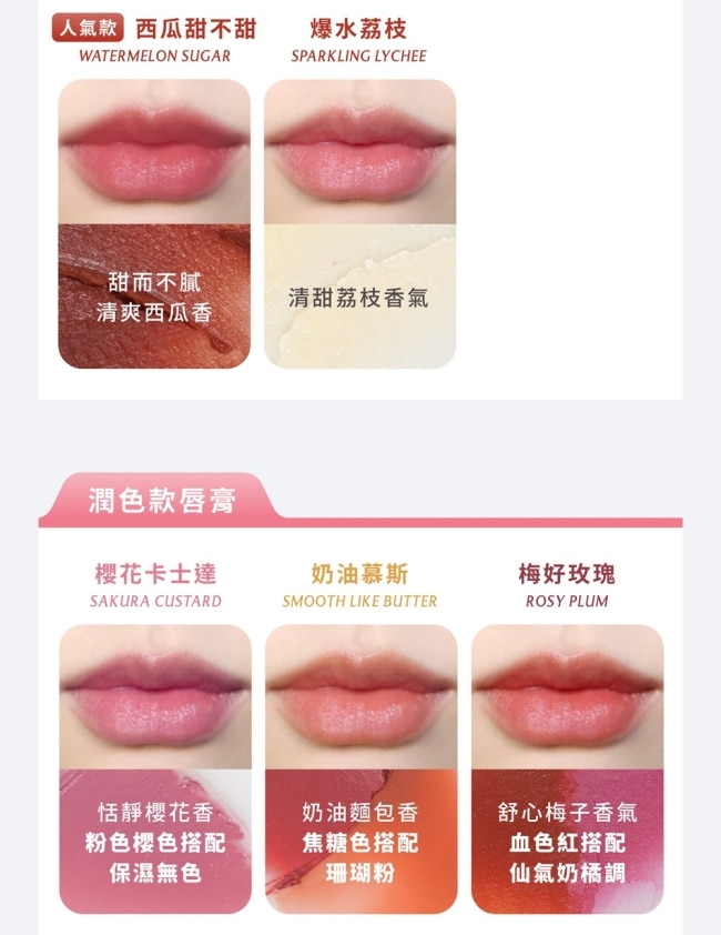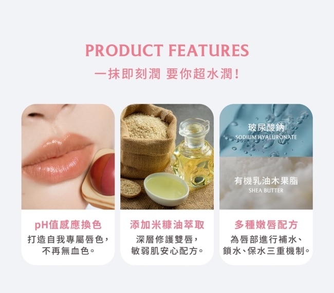 同時為唇部進行補水、鎖水、保水三重機制打造專屬唇色閃耀水潤光澤。