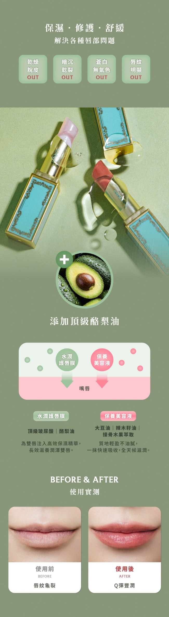 | 商品簡述 | 添加頂級酪梨油、玻尿酸 為雙唇注入高效保濕精華 長效滋養潤澤雙唇。 |