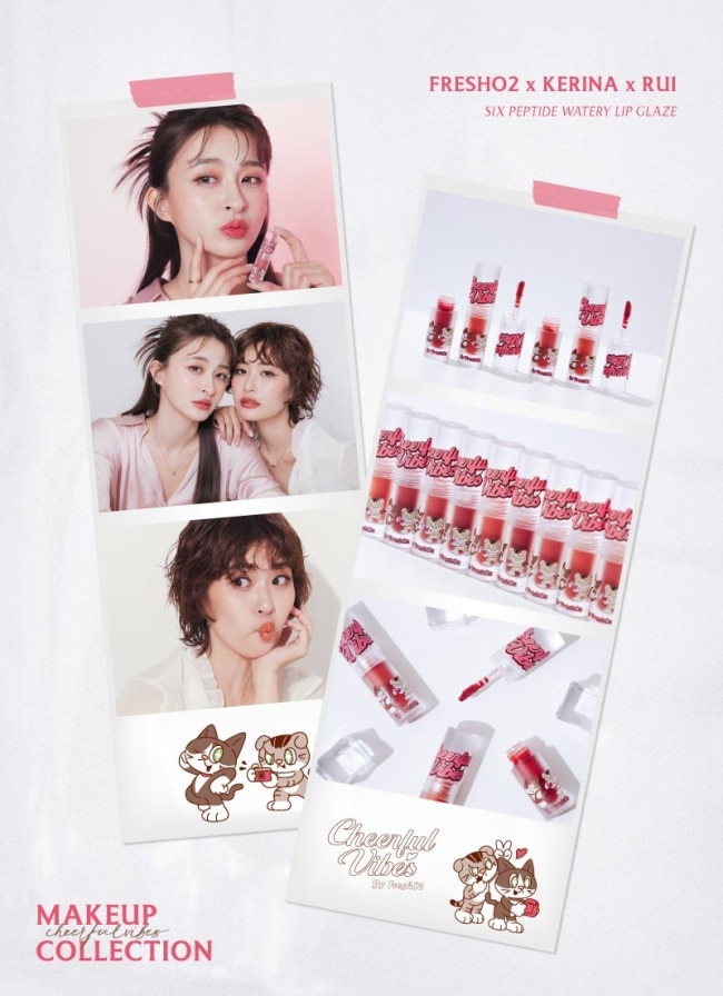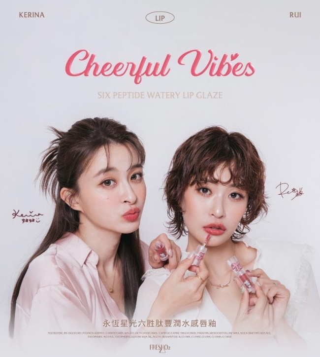 台灣彩妝品牌FreshO2於年末最後一波祭出閨蜜檔彩妝話題聯名攜手擁有40萬粉絲的奇摩13姬超人氣網拍指定模特兒-薛妞妞以及曾擔任知名攝影師並長期居於日本擁有超過20萬粉絲的KOL-陳思瑾小貓正式攜手推出全新Cheerful Vibes三方聯名系列帶來盛大創意驚喜。不僅集合FreshO2彩妝之專業性更透過薛妞妞身為模特對彩妝擁有的豐富經驗及時尚色彩搭配與擁有專業美感且視覺敏銳的小貓聯手聚焦推出四款擁有多元風格必收單品為粉絲們帶來甜美彩妝盛宴