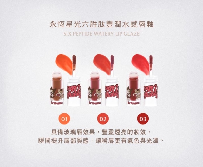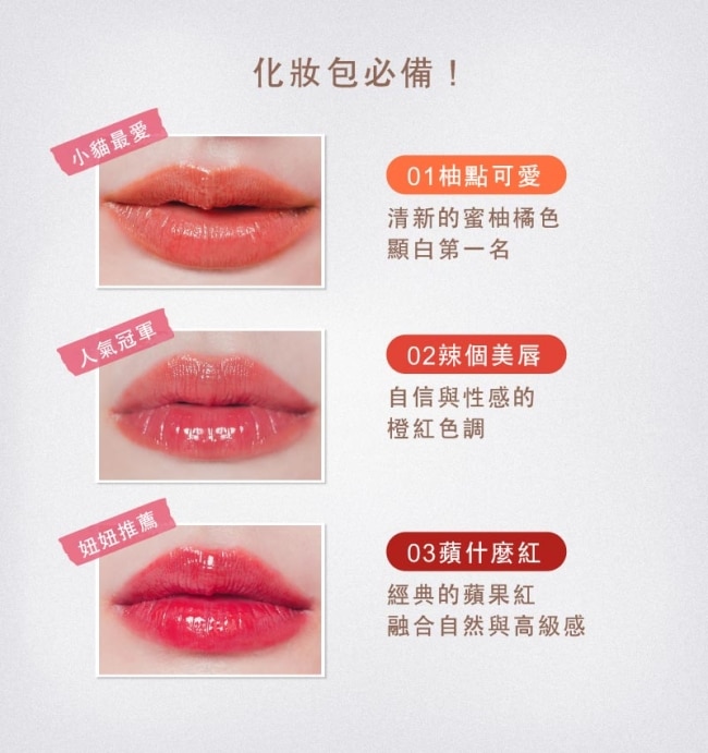 永恆星光六胜肽豐潤水感唇釉融入六胜肽配方讓雙唇在水感亮澤的妝效中同時享受深層滋養與修護一共有三種色號01柚點可愛清新的蜜柚橘色顯白第一的首選甜美可愛的魅力適合日常或輕鬆聚會場合02辣個美唇介於紅與橙之間的性感色調一抹輕鬆成為約會中的焦點03蘋什麼紅經典的蘋果紅融合自然與高級感適合任何場合演繹耐看且大氣的妝容。每一款色號皆以水感質地帶來輕盈舒適的上妝體驗猶如唇間流動的星光展現屬於自己的永恆星光。