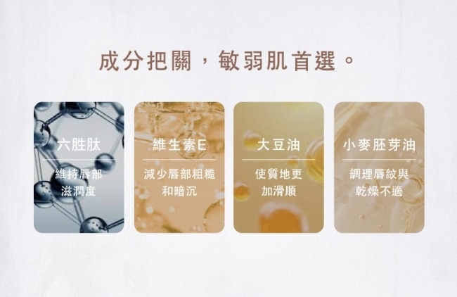 | 商品簡述 | 添加維生素E、大豆油、小麥胚芽油、六胜肽等美唇保養成分質地輕盈不黏膩展現持久光澤感。 |