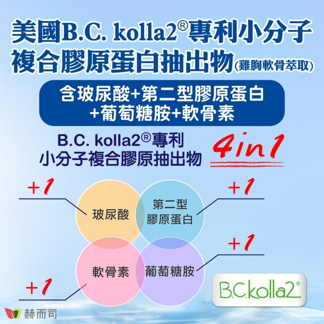 升級添加美國B.C.kolla2原廠專利小分子膠原抽出物(四效合一含口服小分子膠原蛋白/玻尿酸/軟骨素/葡萄糖胺)