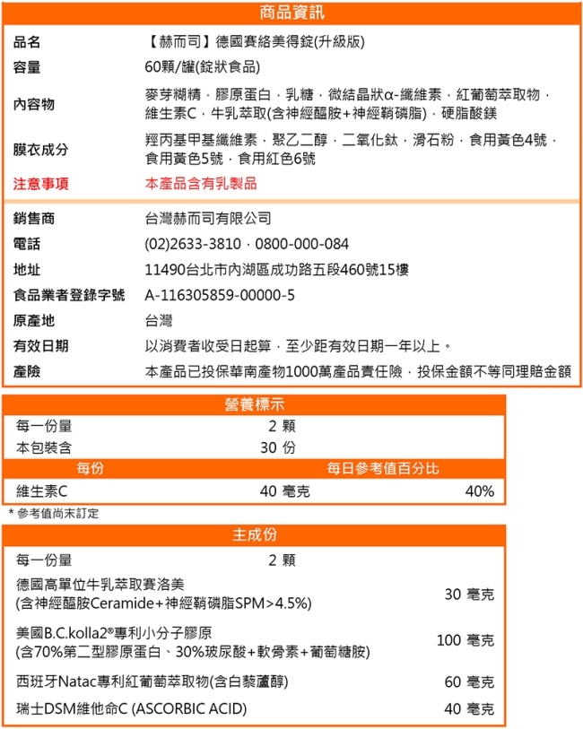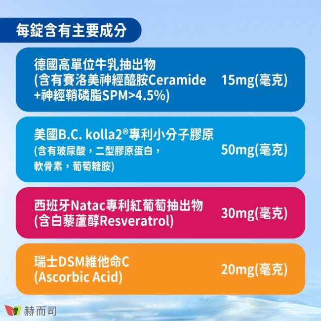 | 商品簡述 | 德國牛乳抽出物(含神經醯胺+神經鞘磷脂4.5%)+美國B.C.kolla2小分子膠原+白藜蘆醇+C |