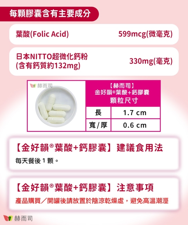 每顆含有高單位葉酸599mcg+鈣132mg
