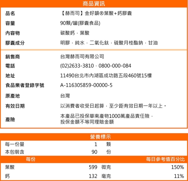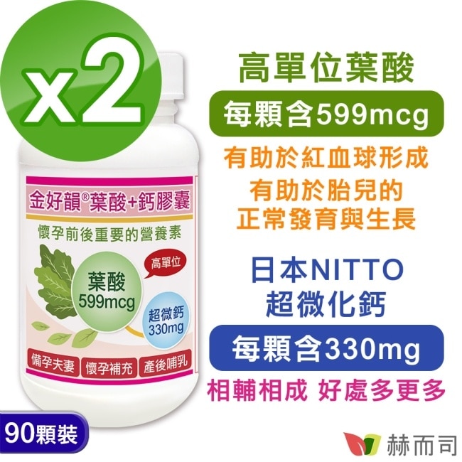 【赫而司】金好韻葉酸+鈣膠囊(90顆*2罐)孕前補養配方高單位葉酸599mcg+鈣132mg