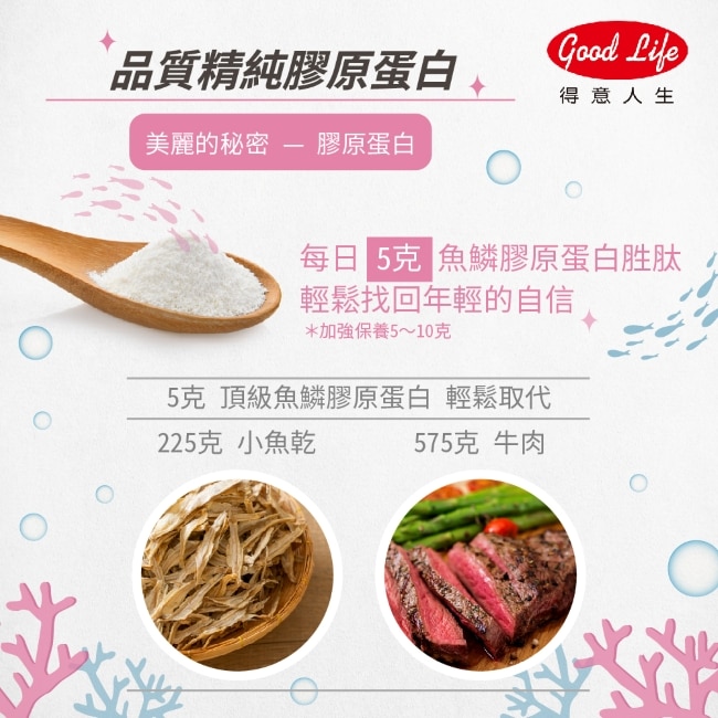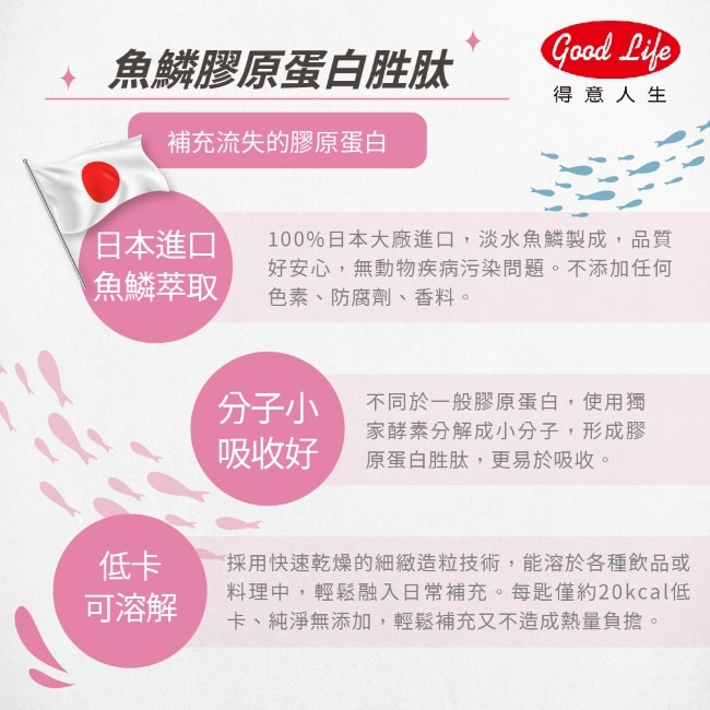 | 商品簡述 | 日本進口魚鱗萃取膠原蛋白吸收好分解快無味易溶於水適合日常添加於飲食中補充。 |