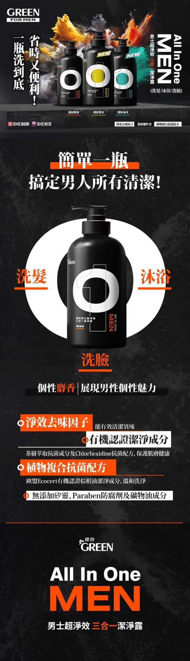 | 商品簡述 | 一瓶洗到底-省時又便利 淨效去味因子 能有效清潔異味濃郁海洋薄荷 展現男性非凡魅力 |