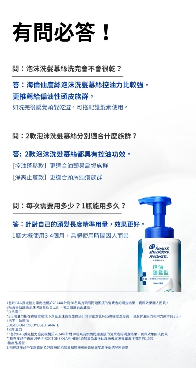 ^基於P&G委託協力廠商機構於2024年針對30名具有頭屑問題困擾的消費者的調查結果實際效果因人而異