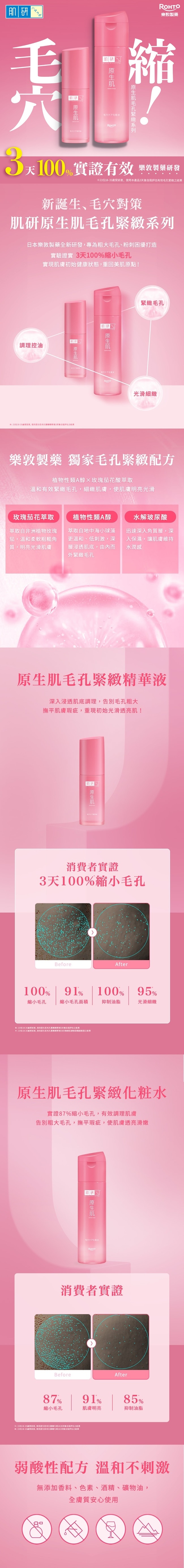 1.樂敦製藥嚴選玫瑰茄花酸與RetinART(植物性類A醇)有效緊緻毛孔、調理油脂分泌改善肌膚粗糙實現肌膚最初始的健康狀態如新生嬰兒般透亮細緻。