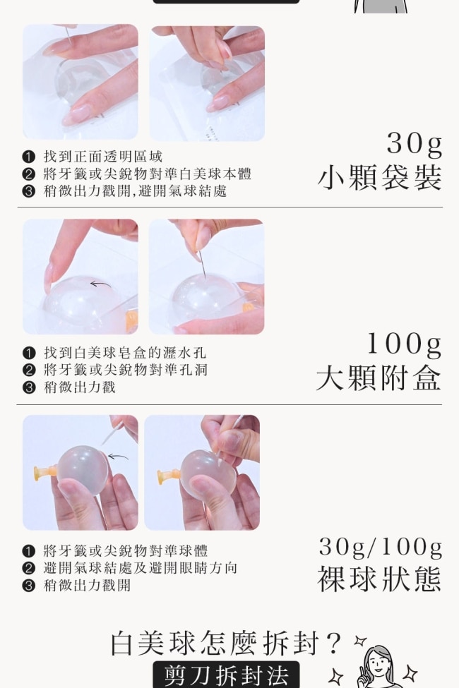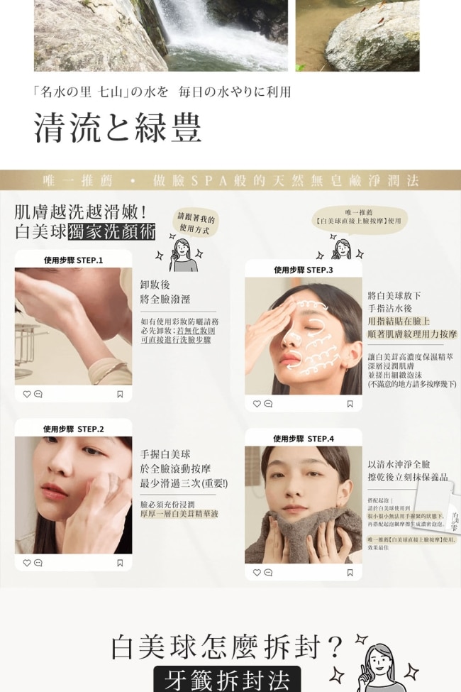 1. 卸妝後將臉潑濕手握白美球於全臉滾動按摩