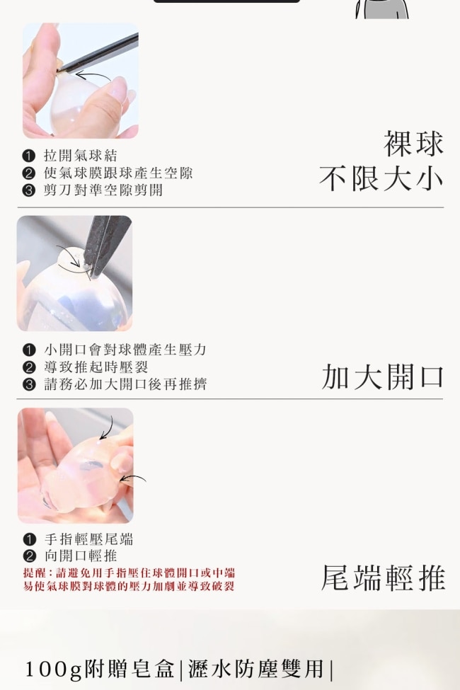 首次使用請將氣球膜脖子處拉起剪除避開眼睛方向