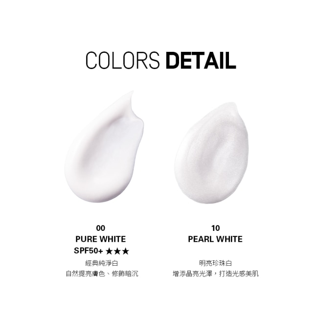 00 純淨白 Pure White SPF50+ ***以經典純淨白色調,自然提亮膚色、修飾暗沉,可單獨使用打造乾淨透亮的膚色表現,亦能作為妝前打底,提升後續底妝的服貼度與持妝度。