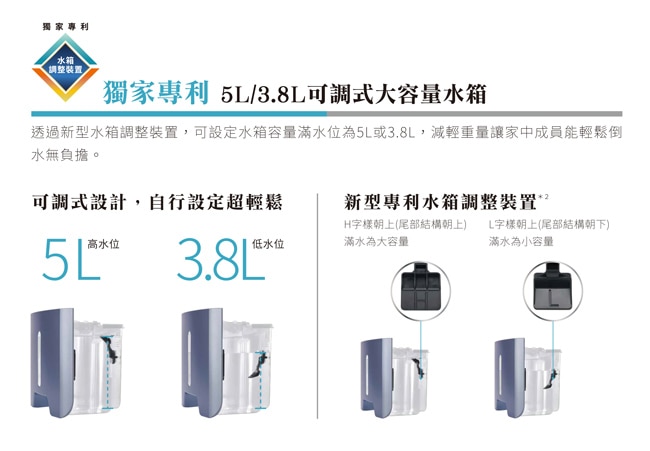 水箱容量2段水位調整(5公升/3.8公升)