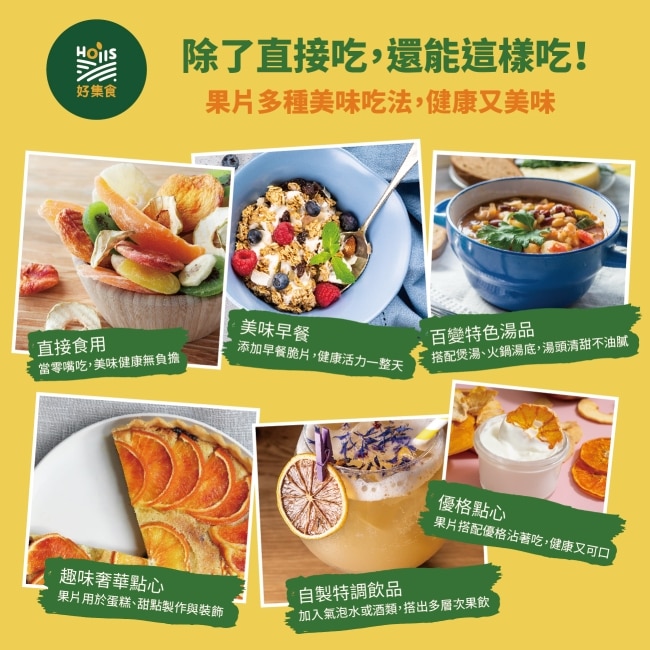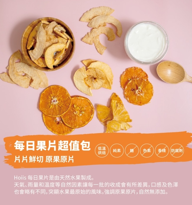 Hoiis果乾是由天然水果製成天氣、雨量和溫度等自然因素讓每一批的收成會有所差異口感及色澤也會略有不同果乾的獨特性保證吃的到真實的自然原味。除了天然更堅持原味零添加沒有任何的偽甜即使果片輕薄也吃的出滿滿的水果原味。