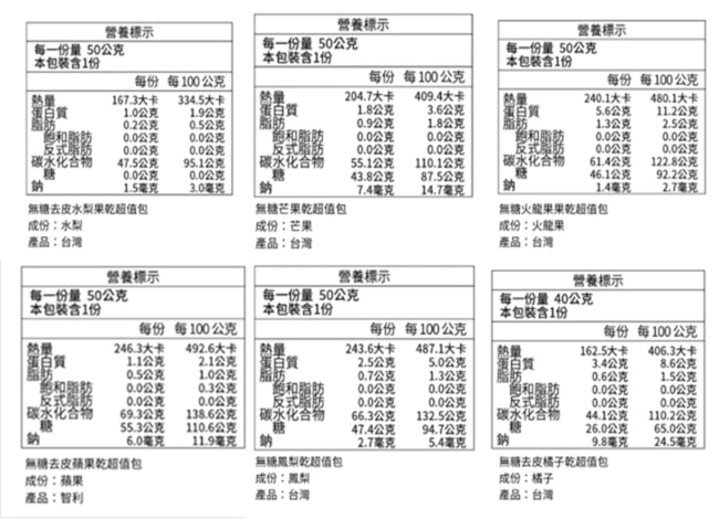 | 內容物名稱 | 原味果乾超值6包(芒果.鳳梨.橘子.紅龍果.蘋果.水梨各1包) |