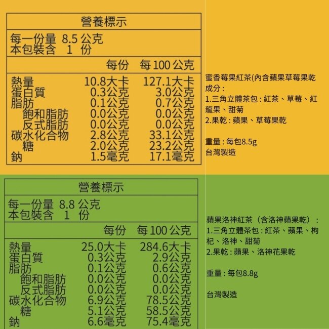 | 包裝份量 | 蜜香莓果紅茶8.5gx6包1、蘋果洛神紅茶8.8gx6包 |