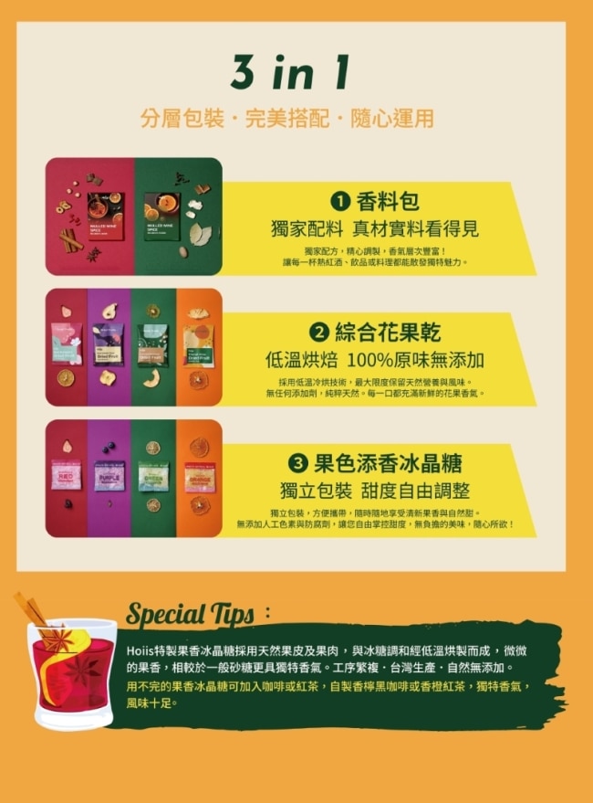 1. 香料獨家精調配方香氣層次豐富讓每一杯熱紅酒或飲品瞬間升級散發出迷人的節日魅力。