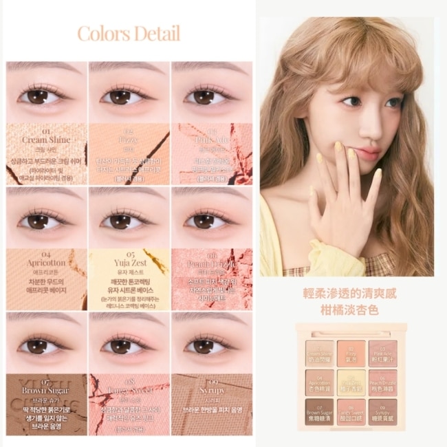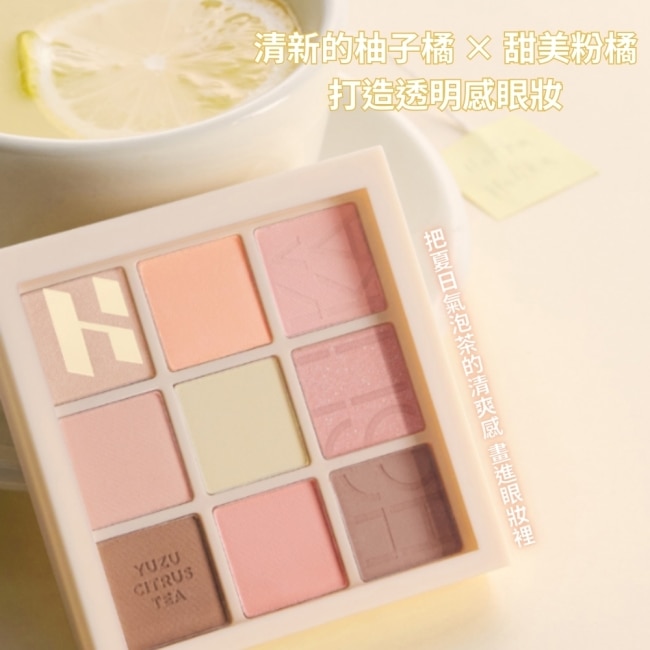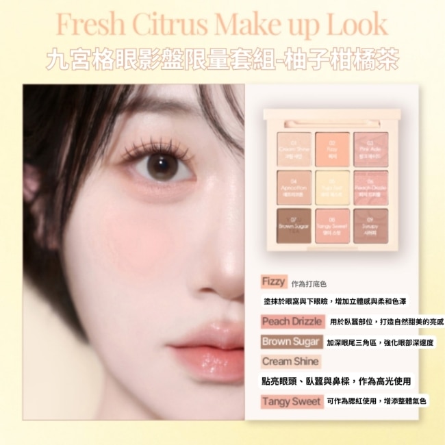 | 商品簡述 | 這款柚子柑橘茶九宮格眼影盤,以清爽柑橘搭配柔美粉橘,打造夏日氣泡茶般的透明感妝容。 |
