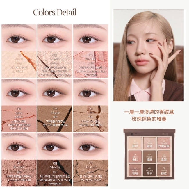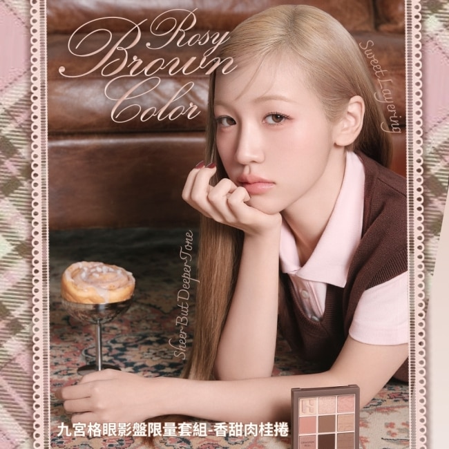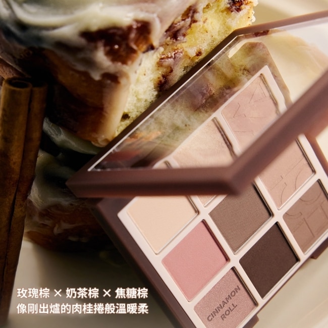 這款以香甜肉桂捲為靈感的九宮格眼影盤,旨在為妝容注入一抹溫暖且深邃的優雅氣息。它完美融合了香醇的奶茶棕、浪漫的玫瑰棕與焦糖色調,讓妝容如同剛出爐的肉桂捲般,散發著令人沉醉的層次感與溫柔氛圍。