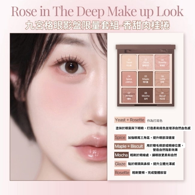 【絕美色選,堆疊深邃眼神】 全盤涵蓋了從輕柔打底到深邃陰影的完整色階。色號Yeast與Rosette適合作為眼窩大面積打底,輕易修飾眼部暗沈並增添自然血色感主調色Spice與Maple則帶有微妙的紅棕調,能輕鬆畫出宛如玫瑰盛開在深秋的Rose in The Deep妝感。而Mocha與Biscuit這類焦糖咖啡色系,則能強化眼尾三角區,讓雙眼瞬間深邃有神,呈現出高級感十足的層次。